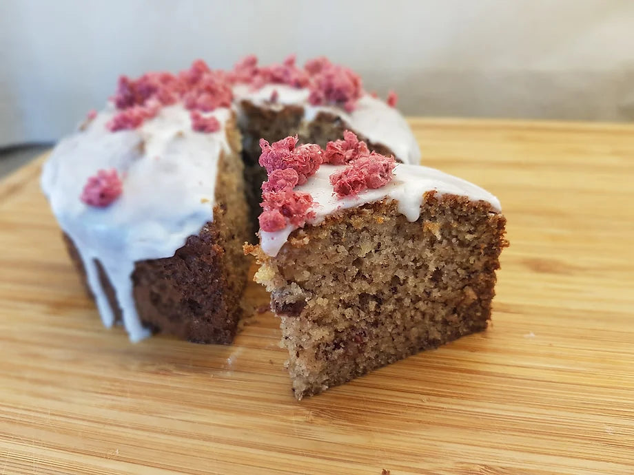 One of our most popular cakes! Fresh bananas and raspberries make up this lightly spiced cake topped with water icing and decorated with dried raspberries. A 6 inch round cake that can serve up to 6.
